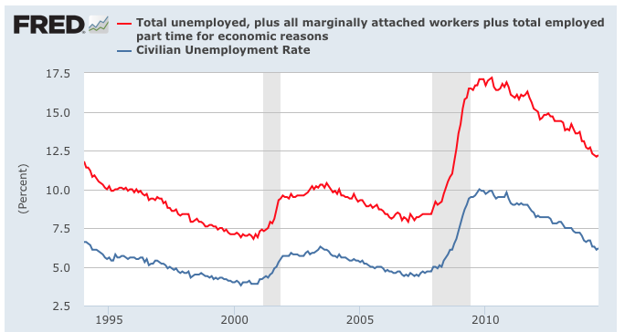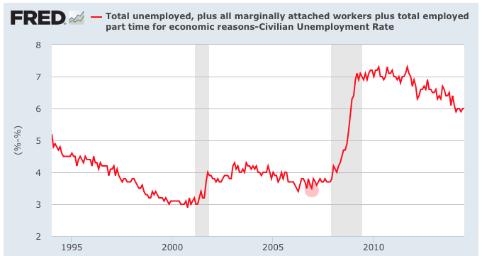 As many of you know, there is another measure of workforce participation that measures a broader spectrum of unemployment termed U-6. Here is a definition for U-6 unemployment: