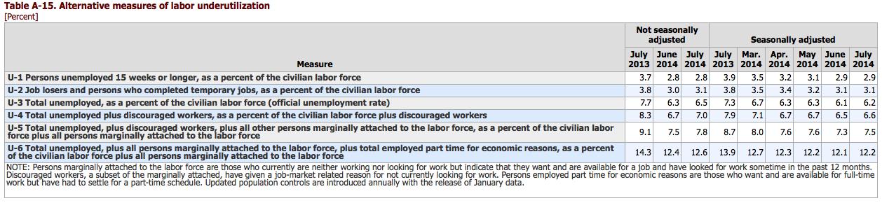 If we look at a chart from the Bureau of Labor Statistics that supplies us with all six measures of labor underutilization, here's what we find for July 2014: