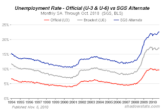The broadest measure of unemployment U6 includes short-term discouraged and marginally attached workers as well as those that are forced to work part-time because they cannot find full-time employment.  In October, U6 stood at 17.0 percent, roughly the same as it has been for the past 18 months.  The SGS (Shadow Government Statistics) Alternate Unemployment Rate "reflects current unemployment reporting methodology adjusted for SGS-estimated long-term discouraged workers who were defined out of official existence in 1994.".  In October, SGS unemployment stood at 22.5 percent also roughly were it has stood for the past 18 months, however, if one looks carefully at the blue line on the chart, it is quite apparent that this number is trending upwards with time (i.e. there are more long-term discouraged workers as time goes on).