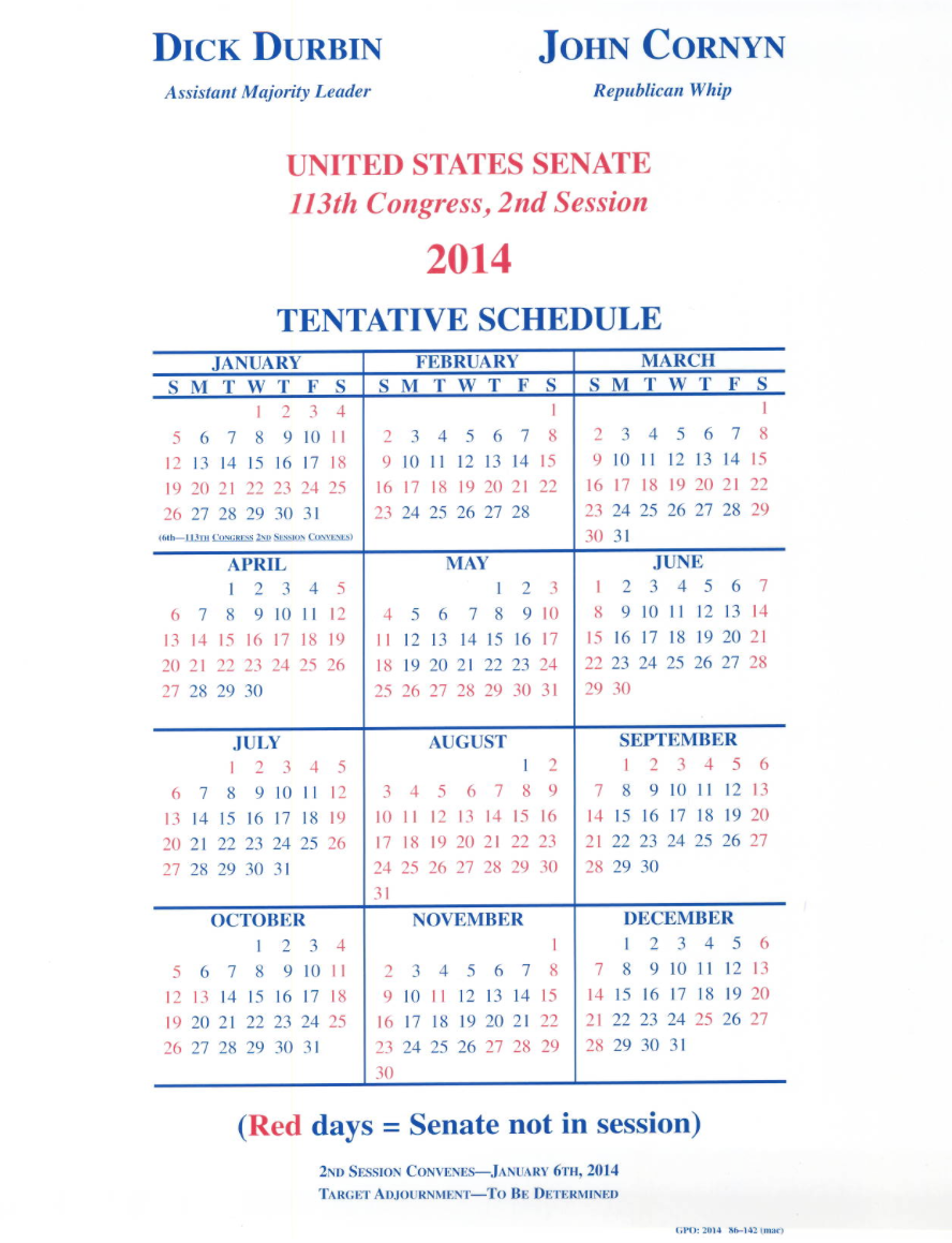 Here is a calendar showing the days that the Senate sat/will sit in the Second Session of the 113th Congress: