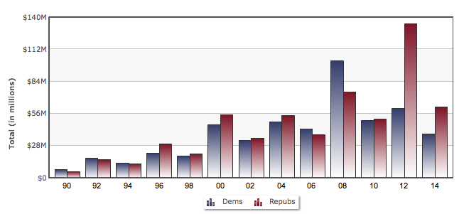 So far, the Democrats have received $21.99 million compared to $30.63 million to the Republicans. In the House, the Republicans received an average of $65,931 compared to $50,814 to the Democrats. In the Senate, the Republicans received an average of $148,679 compared to $152,530 for the Democrats.