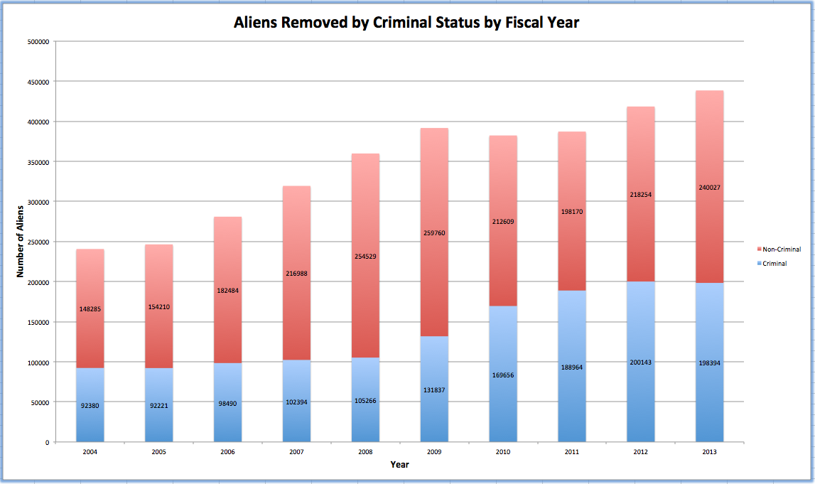 At 438,421, the number of aliens removed in fiscal 2013 hit a new record. This is more than double the level in fiscal 2003. You'll also note how the number of aliens removed has grown at a nearly exponential rate since the turn of the new millennium