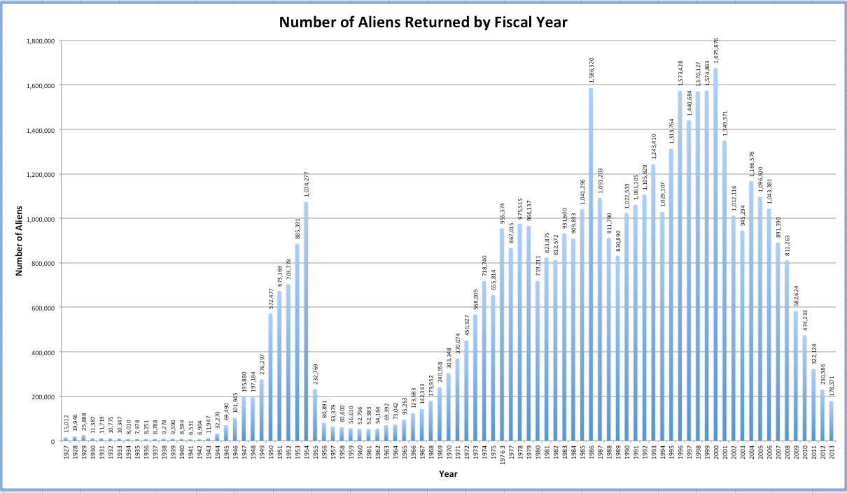 Here is a graph showing the number of aliens returned by fiscal year since 1926: