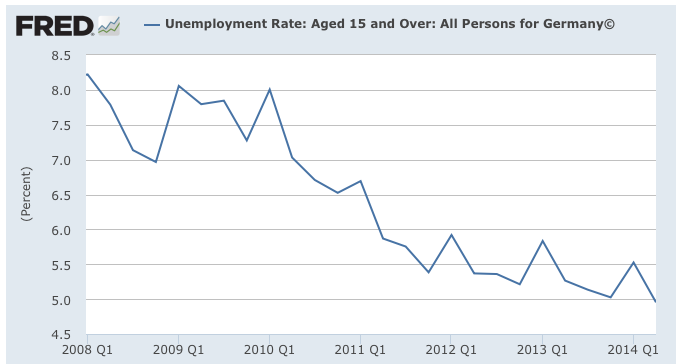 As the Great Recession was entrenching itself in the world economy, Germany's unemployment rate was at 8.2 percent. It hovered between 7 and 8 percent over the duration of the Great Recession when it began to drop, hitting its low (and current rate) of 5 percent at the end of 2013.