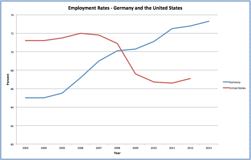 Here is a graph from FRED showing the employment-to-population ratio for both Germany and the United States until 2013: