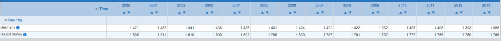 Notice that German workers spent, on average, 1388 hours at work in 2013. This compares to 1788 hours for an average American worker. In 2013, German workers spent an average of 22.4 percent less time at work than their American counterparts. If you look through the data for both nations going back to 2000, this is what you find: