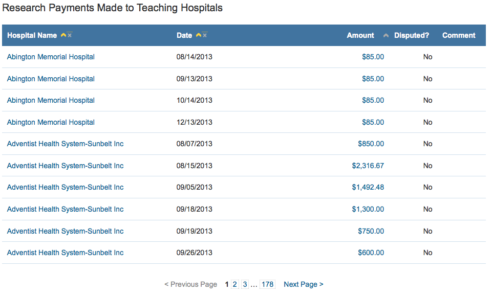 Please note that there are a total of 11,159 pages of payments made by Pfizer to physicians, a total of 49 pages of general payments made to teaching hospitals and a total of 178 pages of research payments made to teaching hospitals. In total, Pfizer made 112,073 total general transactions totalling $21,207,374.91 in general payments along with 1771 total research transactions totalling $18,286,714.72 from August to December 2013 (the first reporting cycle of the new law).
