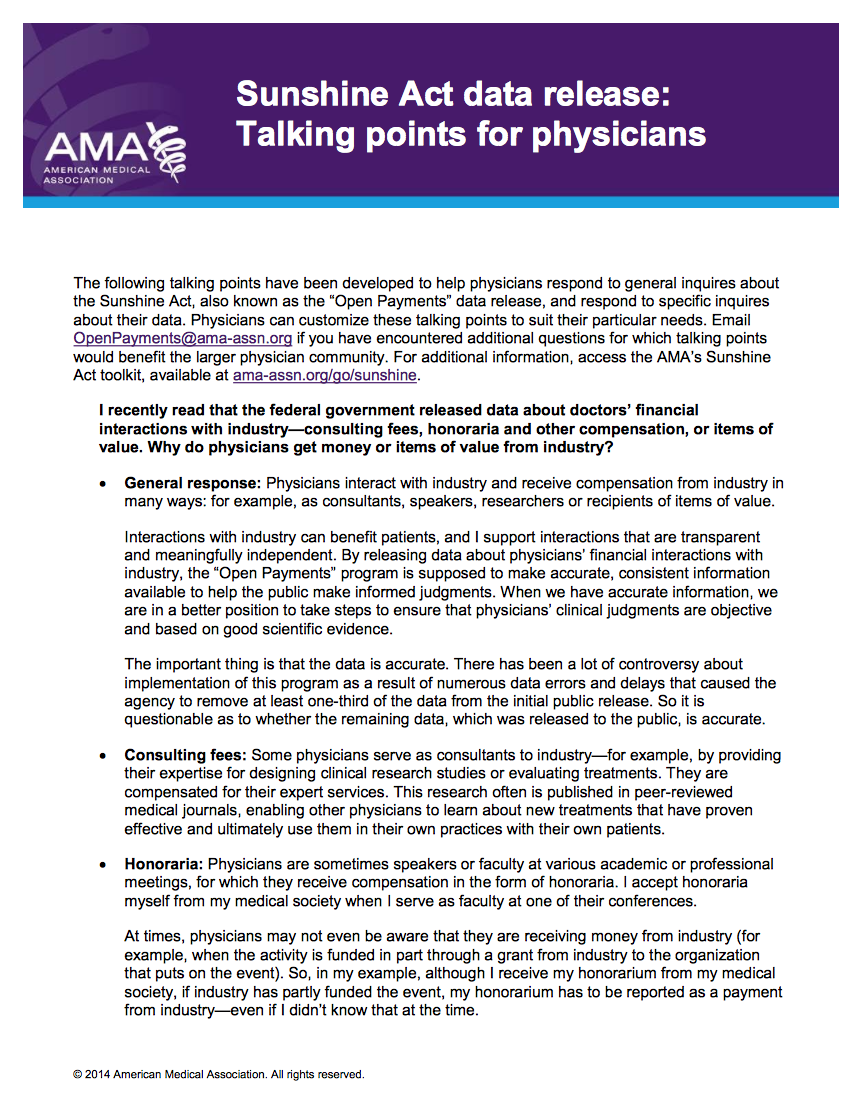 It is interesting to note that the Americal Medical Association even provides its physicians with "customizable talking points" that they can use to respond to inquiries about the Sunshine Act, the first page of which is shown here:
