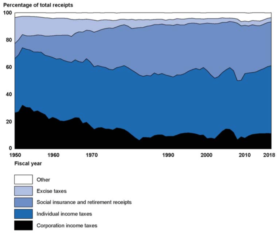Here is a graph that shows how Federal tax revenues as a percentage of total receipts has varied over the decades since 1950: