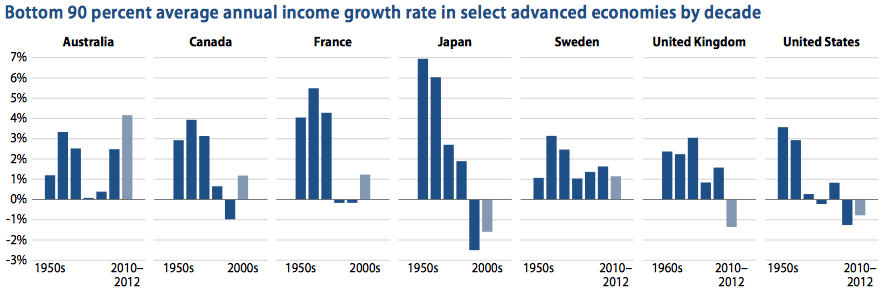 In the report, there are a handful of graphics that go a long way to explaining the issues facing the world's, and particularly America's, middle class. Here is a graphic showing the average growth rate of incomes for the bottom 90 percent of earners over ten year periods from the 1950s to the 2000s, including 2010 to 2012 in light blue, for six advanced economies:
