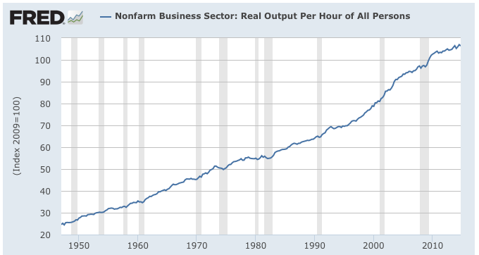 On the other hand, this is what has happened to the real output per hour of American workers: