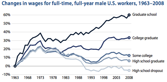 Let's focus on the United States. Here is a graphic that shows the changes in wages for full-time male workers in the United States from 1963 to 2008 based on educational attainment: