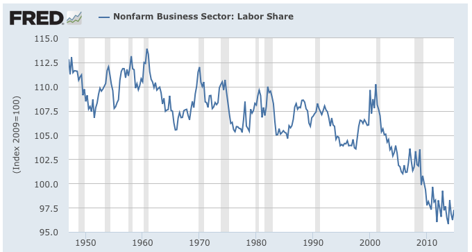 Since the middle of the 2000s, the labor share of income has been steadily dropping, particularly after the Great Recession. In fact, labor's share of income in the third quarter of 2014 was just above its lowest level since 1947.