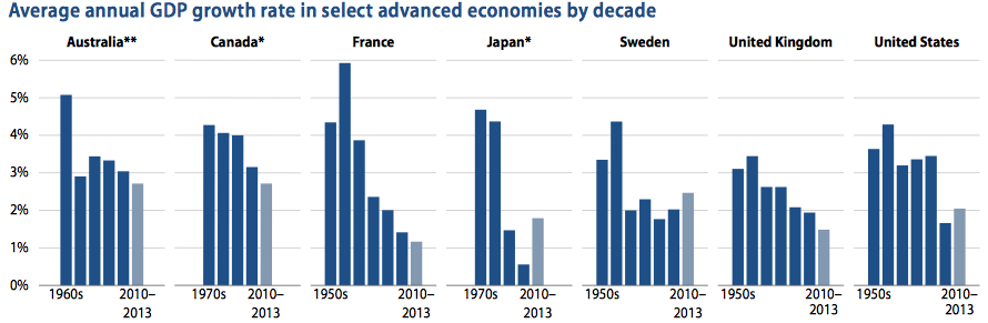 In almost every case, the average annual GDP growth rate in the period between 2010 and 2013 has been significantly lower than what it was in the decades going back to the 1950s.