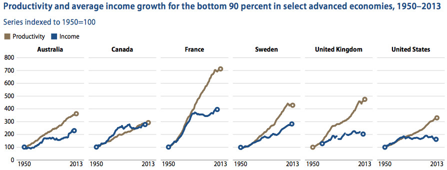 Here is an interesting graphic that compares the growth in productivity (in brown) to the growth in average income (in blue) for the bottom 90 percent for the same six advanced economies: