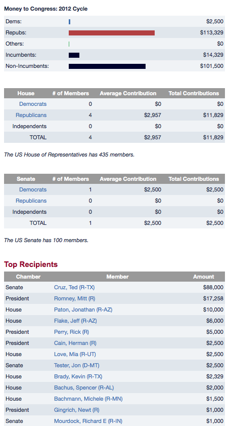 2.) Senate Conservatives Fund: The Senate Conservatives Fund is an independent PAC that is dedicated to electing "true conservatives" to the United States Senate. Its goal is to get Senators to enact policies that will restore America's greatness through cutting spending and balancing the budget without raising taxes, repealing Obamacare, enforcing immigration laws, banning bailouts and defending the Second Amendment of the Constitution. It funds itself through individual donations from grassroots donors. Here is a look at the group's beneficiaries for the 2012 election cycle which also shows that Mr. Cruz was their second highest individual recipient: