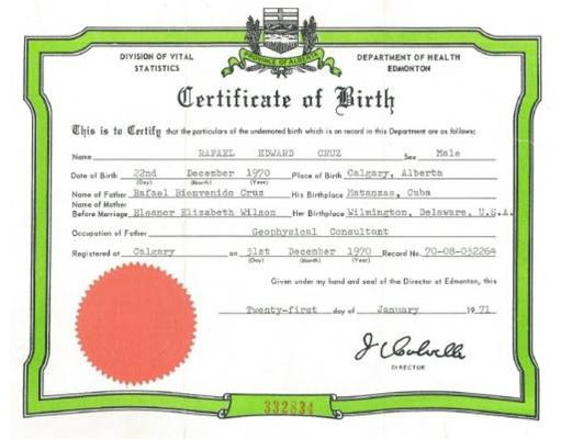 And, just in case you've forgotten, here is a screen capture showing Ted Cruz's birth certificate showing that he was quite clearly born in Canada, albeit to American parents: