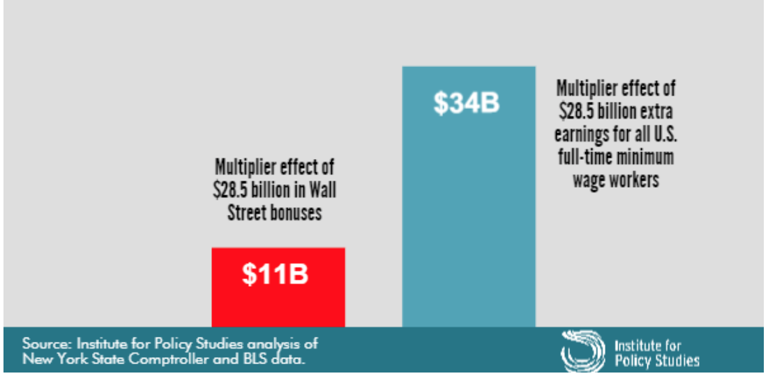 As I have noted in a previous posting, while wealthy Americans can afford to purchase more goods than poorer Americans on an individual basis, on a group basis, the purchasing power of the less well off masses is substantially greater. After all, how many toasters will one billionaire purchase compared to the number purchased by hundreds or thousands of middle class households? Based on the standard fiscal multipliers used by Moody's Analytics, every dollar that goes into the pockets of lower-wage workers adds about $1.21 to the national economy compared to only $0.39 for high income earners. As shown in this graphic, if the $28.5 billion in bonuses had been allocated to minimum wage earners, GDP in 2014 would have grown by $34.5 billion rather than the $11 billion when the entire bonus pool ends up in the wallets of Wall Streeters: