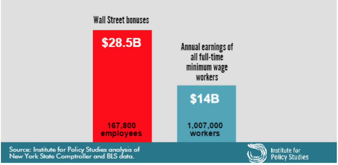 During 2014, Wall Street bonuses totalled more than twice the total earnings of more than a million American minimum wage earners.