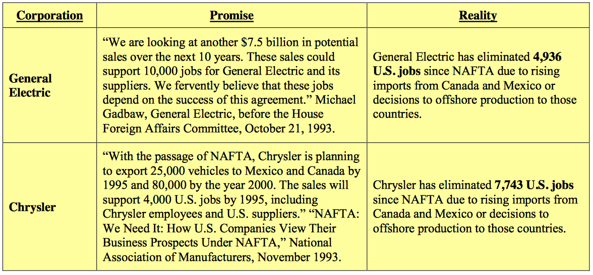 Here is a look at a two of the specific corporate promises that were made before NAFTA was signed and what actually happened: