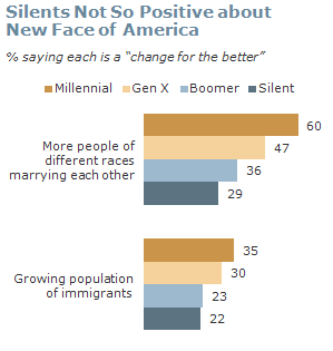 It is interesting to see that the Silent Generation, who make up 17 percent of all voters and are 79 percent non-Hispanic whites, have become increasingly discontent.  They are the whitest of the generations and the least accepting of immigration and interracial marriages as shown on this graphic: