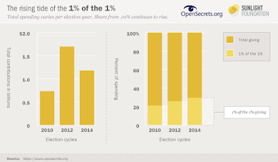 Given that a recent study by the Sunlight Foundation and the Center for Responsive Politics noted that 31,976 donors or one percent of one percent of the total population of the United States accounted for $1.18 billion or 29 percent of all disclosed political contributions during the 2014 election cycle and the fact that this group has grown in influence over the past three election cycles as shown here: