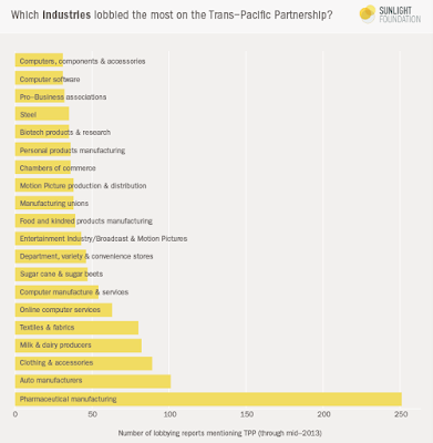 Here is a graphic that shows the top 20 industries that have lobbied in favour of the TPP by the number of lobbying reports filed through to the middle of 2013: