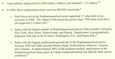 Mr. Toohey also notes that the average biopharmaceutical employee paid approximately three times the amounts of federal and tax paid, on average, by employees across all other sectors (2006 data) and that Big Pharma contributed $294.6 billion to GDP in 2006 or 2.2 percent of total GDP in that year.