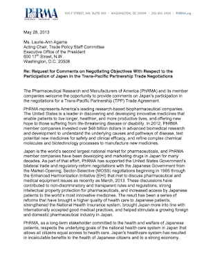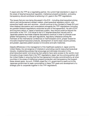The documents submitted include this letter commenting on negotiating efforts that should be made with respect to the participation of Japan and its massive market for pharmaceuticals (the second largest in the world) in the TPP: