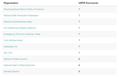 In addition, Sunlight Foundation examines the top organizations that have written the most public comment letters to the Office of the U.S. Trade Representative regarding the TPP. According to Docket Wrench, the pharmaceutical industry through PhRMA has written 7 comments to the USTR as shown on this table: