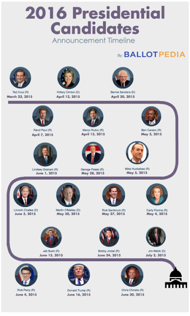 USA: Oye! Times readers Get FREE $30 to spend on Amazon, Walmart…From what we read in the mainstream media, one would think that there are quite a plethora of candidates running for the November 8, 2016 presidential election. According to a cute little graphic from Ballotopedia, here is a listing of the candidates for both parties and the dates that they announced their candidacy: