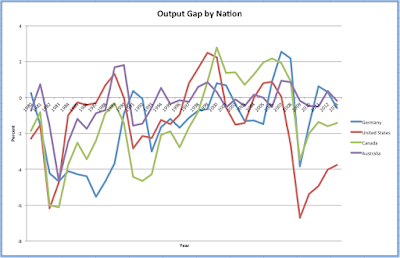 Now, let's compare the output gap in the United States (in red) to Canada (in green), Germany (in blue) and Australia (in purple):