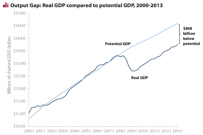 By 2013, the economic output of the United States was $868 billion (in 2005 chained dollars) below its potential because of the output gap.