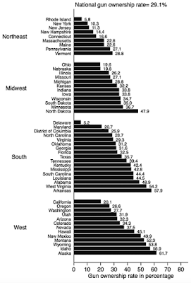 Among all 4000 respondents, the prevalence of gun ownership rates by state varied from a low of 5.2 percent in Delaware to 61.7 percent in Alaska compared to a national gun ownership prevalence of 29.1 percent. It is interesting to look at the wide state- and region-level variation in gun ownership rates by state. In the northeast, gun ownership rates vary from 5.8 percent in Rhode Island to 28.8 percent in Vermont. In the midwest, gun ownership rates vary from 19.6 percent in Ohio to 47.9 percent in North Dakota. In the south, gun ownership rates vary from 5.2 percent in Delaware to 57.9 percent in Arkansas and in the west, gun ownership rates vary from 20.1 percent in California to 61.7 percent in Alaska. As you can see, on average, gun ownership was lowest in the northeast states and highest in the southern states.