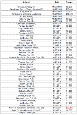1.) Republicans: In 2015, Mr. Trump has made two donations to the Republican Party in both New Hampshire and South Carolina, each of which received $5000. In 2014, he donated $2600 to Lindsay Graham and $3000 each to Tom Cotton, Jeff Sessions and Barbara Comstock among others as you can see on this table: