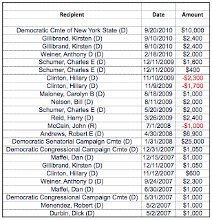 One candidate's name sticks out, Ms. Hillary Clinton. Between 2002 and 2009, Ms. Clinton received a total of $3700, a rather paltry amount given that she was taking a run at the highest office in the nation. Between 1993 and 2003, Edward Kennedy received total donations of $5000 and between 1989 and 2003, John Kerry received total donations of $5500. As well, Harry Reid received $7400, Charles Schumer received a whopping $10,900 and the much-beleaguered Anthony Weiner received $4300 spread over two donations in 2007 and 2010.