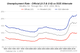 A wonderful website called Shadow Government Statisticspublishes great charts showing the U-3 and U-6 unemployment rates and their own SGS Alternate rate which roughly approximates the old pre-1994 BLS method of calculating long-term discouraged workers who are no longer counted in BLS statistics. Here is their chart showing the three unemployment rates: