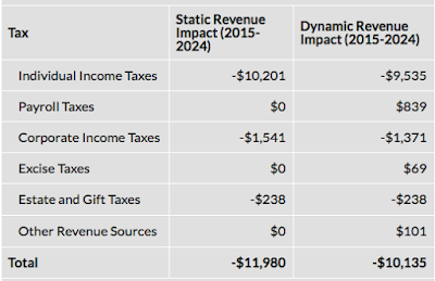 On a static basis (i.e. assuming no impact of tax cuts on economic growth), federal tax revenue would drop by $11.98 trillion over a ten-year period with $10.2 trillion of the loss being due to the reduction in personal income taxes. As well, corporate income taxes would be reduced by $1.541 trillion. If the economic growth that results from lowered taxes is included, the negative impact on revenue would be only $10.14 trillion.