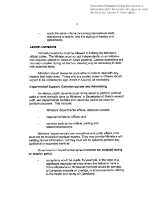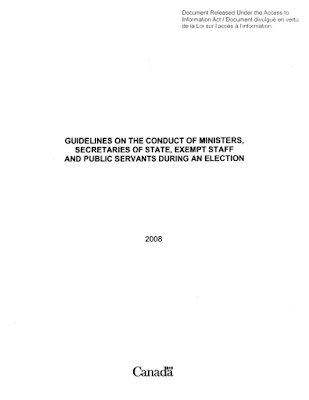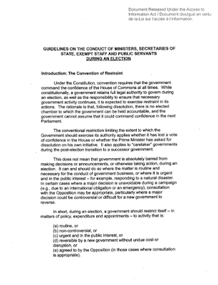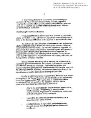 Historically speaking, Canadian governments have been reluctant to release the details of the Caretaker Convention. Fortunately, an Access to Information request made by fellow blogger James Bowden shed the light of day on this document back in 2011. Here is a copy of the Caretaker Convention dated 2008 that was released by the Harper government of the day and here are a series of screen captures showing the first few pages of the 2008 document: