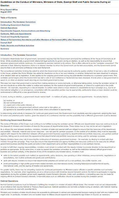 Now that we have that background, let's move to the current election. In what appears to be unprecedented openness, the Harper government through the Privy Council Office, proactively released the Caretaker Convention document on August 2nd, 2015, the day that Stephen Harper announced the 2015 election and, coincidentally, the Canadian long weekend when the media and Canadians weren't paying attention. Here is a screen capture of the first part of the document which includes exactly the same elements as the pages attached above: