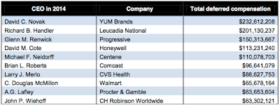 4.) Tax deferment works in the favour of these CEOs; Fortune 500 CEOs have saved $78 million on their 2014 tax bills alone by putting an additional $197 million into these tax-deferred compensation accounts than they could have if they were under the same tax regulations as the "sweaty masses". Here is a table showing the ten largest CEO Deferred Compensation Accounts: