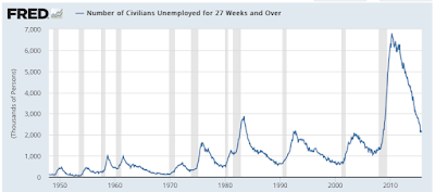 As we all know, by definition, workers are considered to be long-term unemployed when they are unemployed for 27 weeks or longer. As shown on this graph, the number of long-term unemployed workers is still higher than it was prior to the Great Recession: