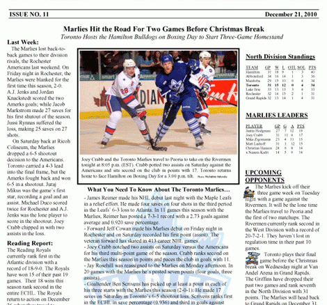 Toronto Marlies week of Dec 21, 2010 December 22, 2010 Robert Mull Hockey 0 You can publish this article on your website as long as you provide a link back to this page.