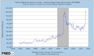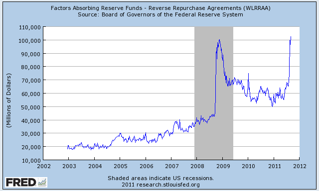 Sorry for the distraction. Let’s go back to the first graph. This graph shows the reverse purchase agreements for Foreign Official and International Accounts (RRAFOIAL). Foreign Official Accounts include assets held by the Federal Reserve for foreign governments, central banks and a small number of government investment funds and other international organizations including the IMF and the BIS. In other words, this measure shows the amount of funds that the world’s central banks and other official bodies have deposited at the Federal Reserve. Data shows that the reserve funds from "Official Foreign Accounts" have doubled since the start of the year from $53 billion in January 2011 to $102 billion at the end of August 2011 with a marked increase from $65 billion since mid-July when the Eurozone debt crisis reached near catastrophic proportions. This massive increase, seen only once before this decade just as the world’s credit markets froze during the advent of the Great Recession, means that central banks around the world are concerned about the security of their deposits so, rather than placing them with what are seen to be risky European banks, they are putting money on deposit with the seemingly stable United States Federal Reserve.