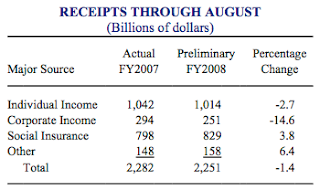 Notice that corporate income taxes for the first 11 months of 2008 were $251 billion, over 75 percent higher than what they were in 2010 and 2011, despite the fact that the economy was starting to circle the white porcelain bowl, particularly in comparison to 2010 and 2011.  At this point in fiscal 2008, corporate taxes were 24.75 percent of revenue sourced from individual income taxes, nearly twice as high as in fiscal 2011.