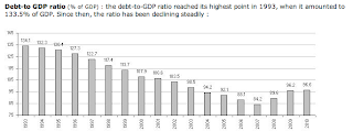 According to the Belgian government’s Debt Agency website, Belgium’s Federal Government Debt amounted to €347 billion at the end of June 2011. In comparison, Spain’s debt is €566 billion and Germany’s is €1131 billion. While a debt of this size seems small compared to the nominal debt of the United States, Japan and its Eurozone partners, one must keep in mind that Belgium’s economy is tiny when compared to that of Germany, the U.K. and Italy. Belgium’s debt-to-GDP has varied widely over the past two decades. Here is a graph showing the ratio since 1993: