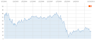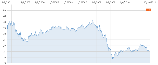A share that was trading in the $40 range when he took the reins has had a pretty good haircut with shares down to $16 and change, a drop of roughly 60 percent. GE hit a record high of nearly $60 back in September 2000 in it’s pre-Immelt days and it’s been a pretty steady downhill ride from there. If I was a shareholder, I’d certainly be none too pleased with GE’s performance.