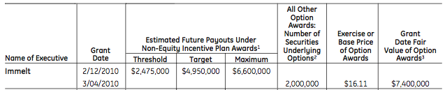 Mr. Immelt was granted 2,000,000 shares at an exercise price of $16.11 on March 4th, 2010. In three years, 50 percent of these options vest followed by the remainder on the fifth anniversary of issuance. Further, he was granted a Non-Equity Incentive Plan Award between $2,475,000 and $6,600,000 based on whether or not the company meets its performance targets.