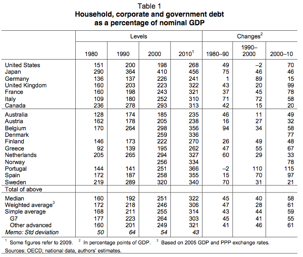 According to the authors, the level of all three types of debt has risen relentlessly over the past three decades, from 167 percent of GDP in 1980 to 314 percent of GDP in 2010, a rise of 5 percentage points per year over the 30 year period. Governments account for 49 percentage points of the increase, corporations for 42 percentage points and households for 56 percentage points.