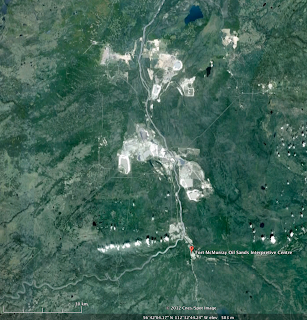 Lastly, here is a Google Earth view of the oil sands operations and the Athabasca River noting the scale in the bottom left side of the screen capture: